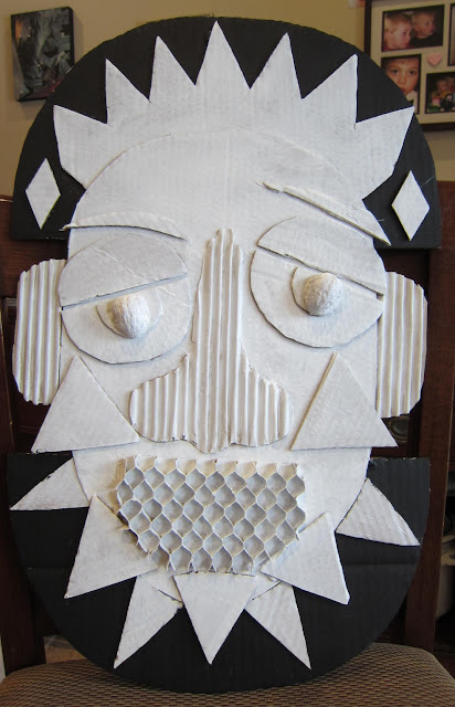 We have been having some fun making African Masks from cardboard.... but I'm pretty sure no genuine African would ever want to be associated with this face!